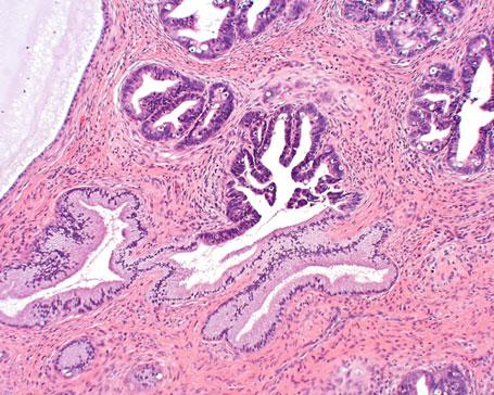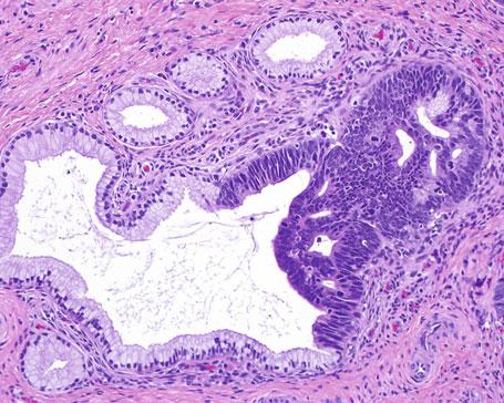 Fot. 4. Przejście prawidłowego nabłonka gruczołowego szyjki macicy w nabłonek raka gruczołowego in situ. Podścielisko szyjki macicy bez inwazji raka.