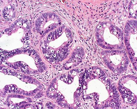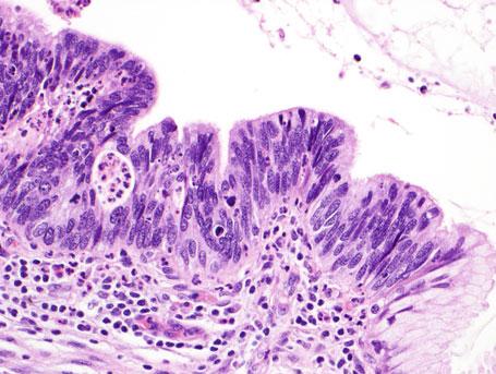 Atypowy nabłonek gruczołowy tapetuje gruczoły szyjkowe ogniskowo, wieloogniskowo lub w sposób rozlany, a zwykle występuje przejście prawidłowego nabłonka gruczołowego w nabłonek proliferujący (Fot. 4). Komórki atypowego nabłonka gruczołowego są silnie stłoczone, układają się w dwa lub więcej rzędów, a mikroskopowo obserwuje się pseudowarstwowość (Fot. 5). Obserwuje się struktury brodawkowate i sitowate. Inwazja podścieliska nie występuje.