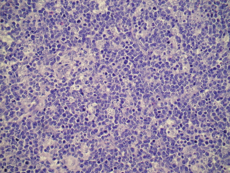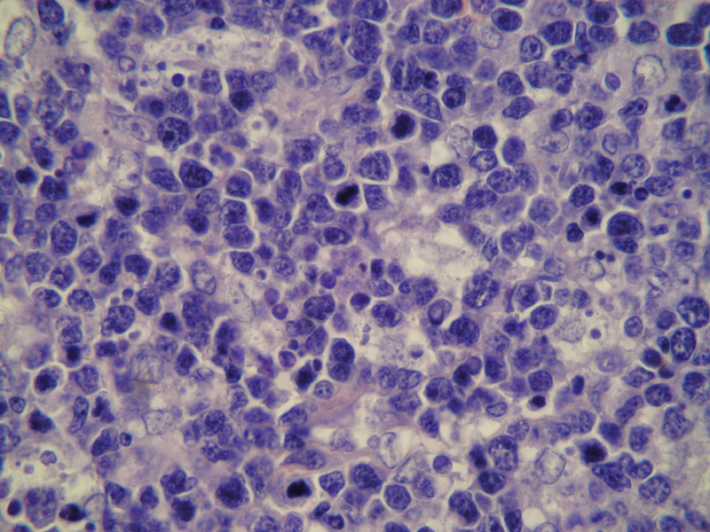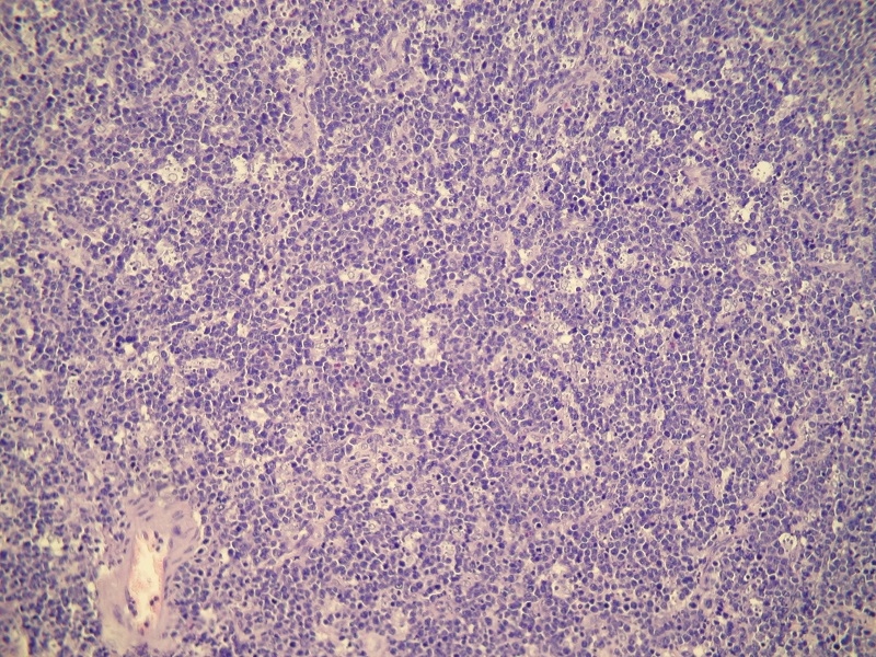 • guz złożony z atypowych, nowotworowych limfocytów o średniej wielkości (2-3 x większych od średnicy erytrocytu), z miernym polimorfizmem; jądra atypowych limfocytów owalne i okrągłe, z wyraźnymi jąderkami (Fot. 3),