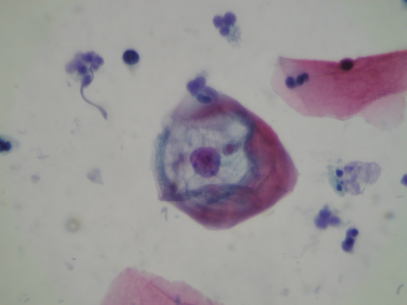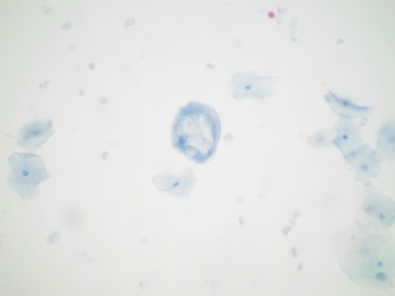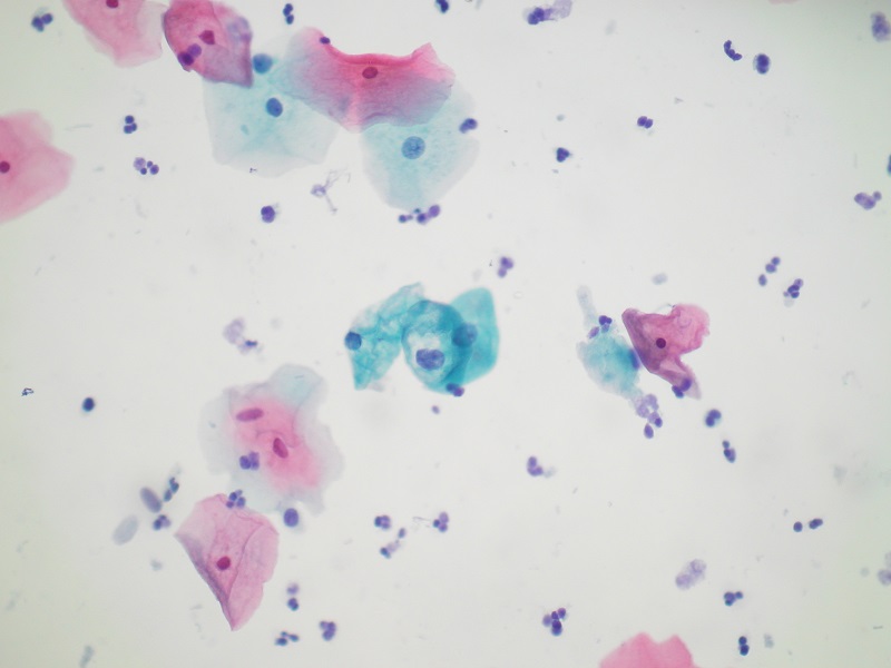 Wynik: Nieprawidłowe komórki nabłonka płaskiego – zmiany związane z infekcją HPV (nieliczne komórki z cechami infekcji HPV) (Fot. 1-2), pałeczki kwasu mlekowego oraz cytoliza komórek